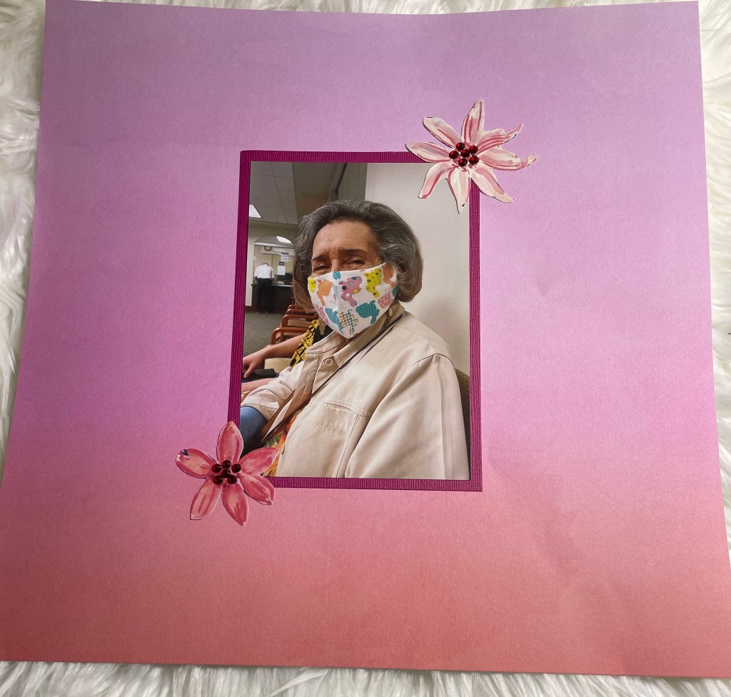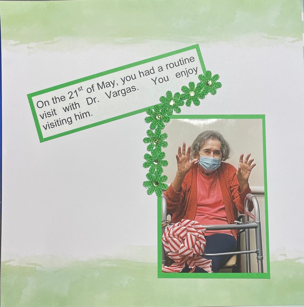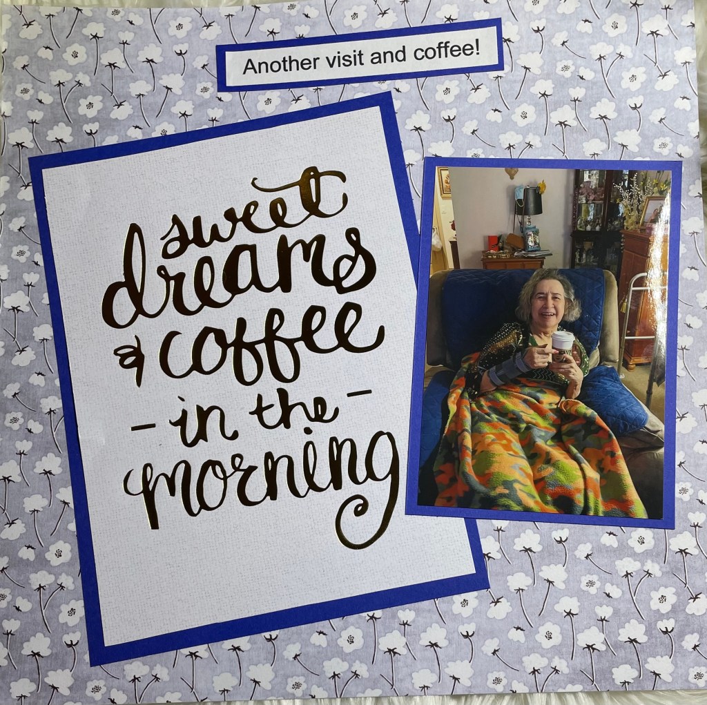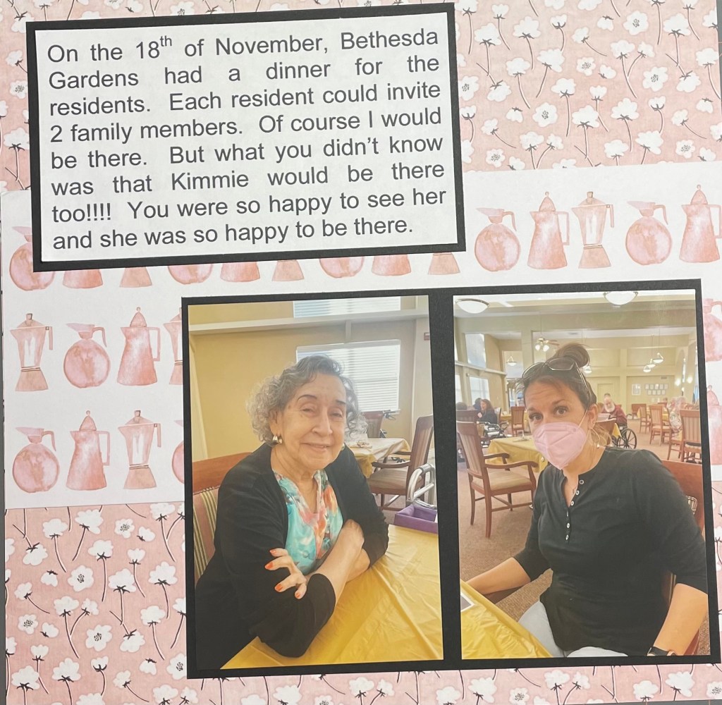 Hello and welcome back to another installment of simple scrapbook pages for my mom. As I have mentioned before, my mother resides in an assisted living facility and she has vascular dementia. I have decided to make her an scrapbook album to show her what she did when the facility was not in lockdown. I am making all the pages simple so she can better concentrate on the story, not a lot of embellishments. Although I’m sure she would like that as well.
