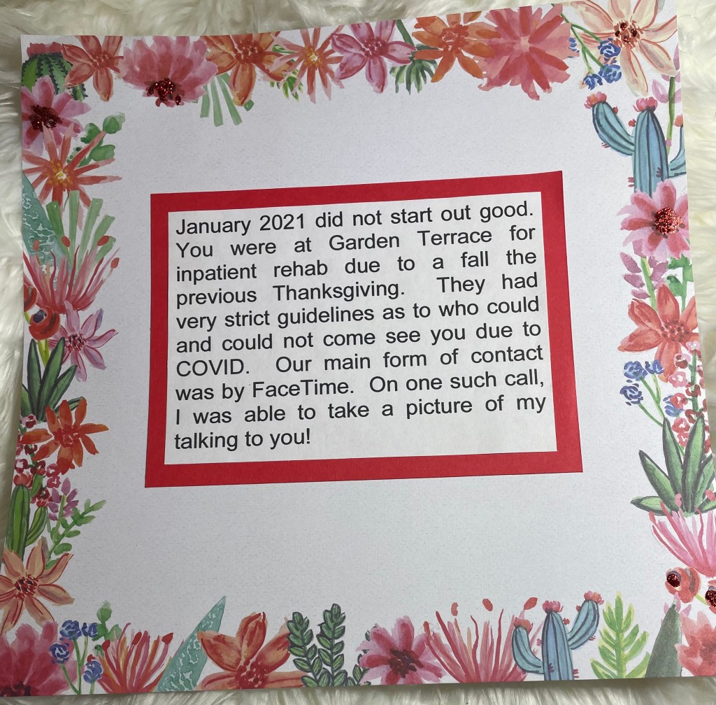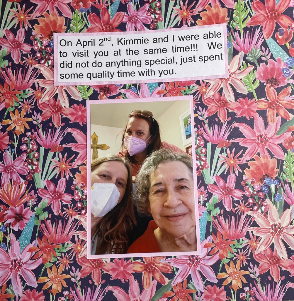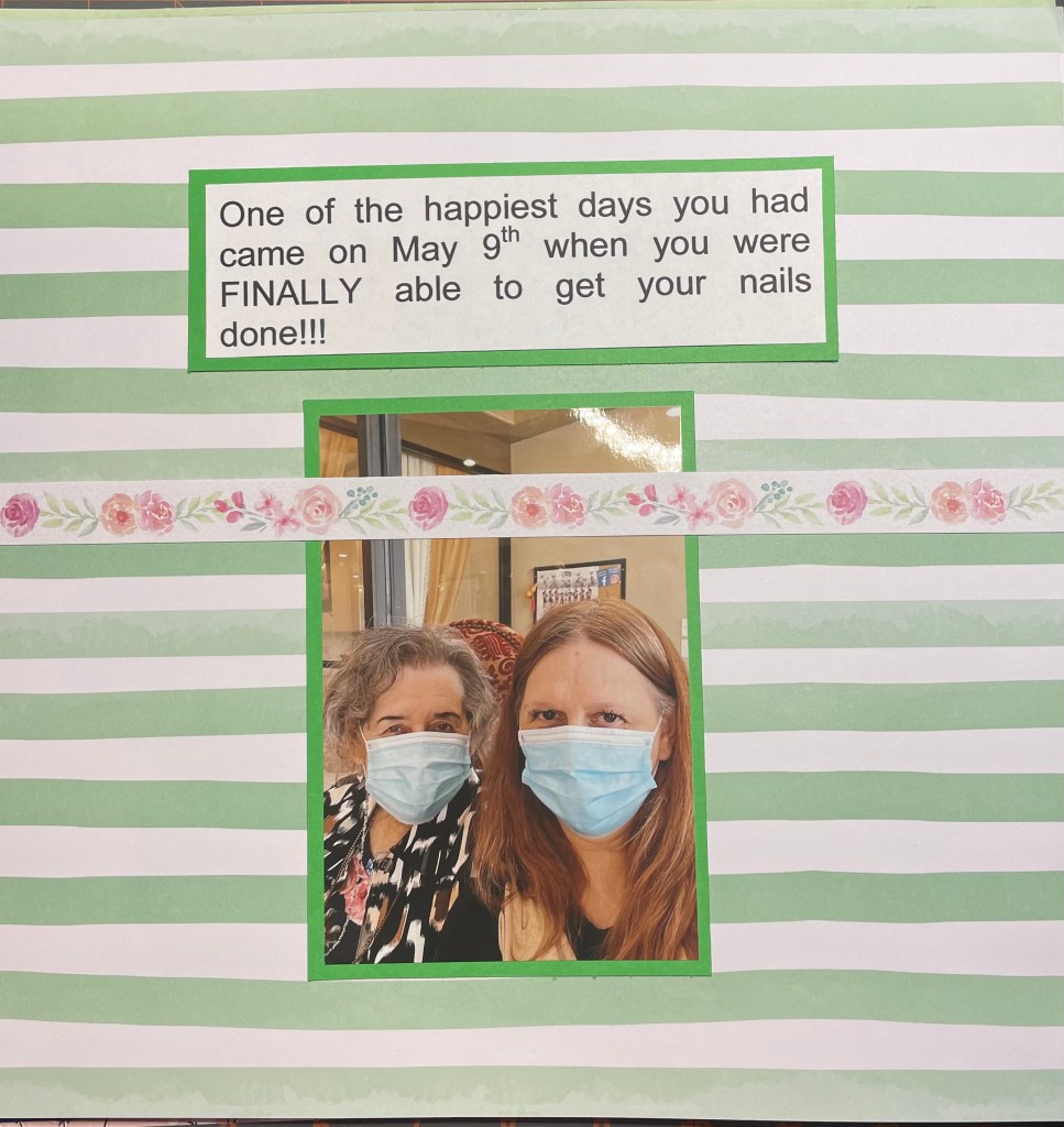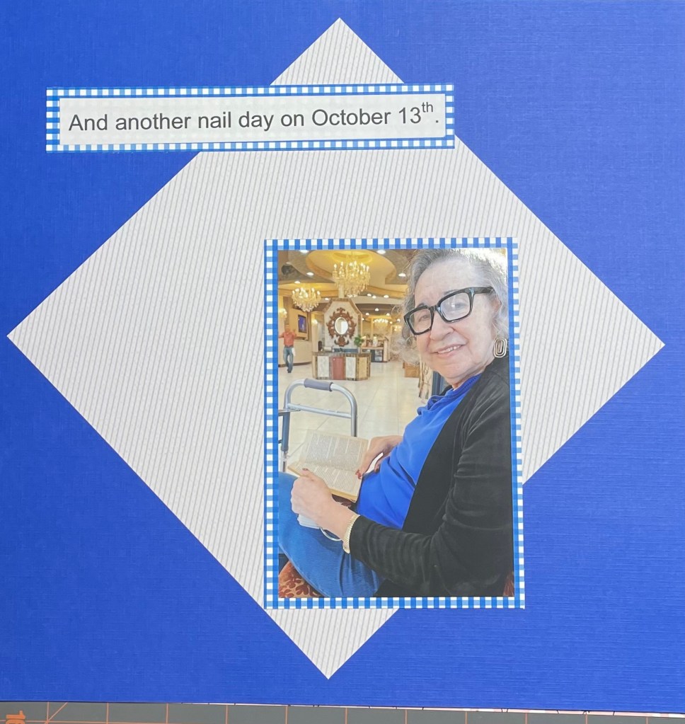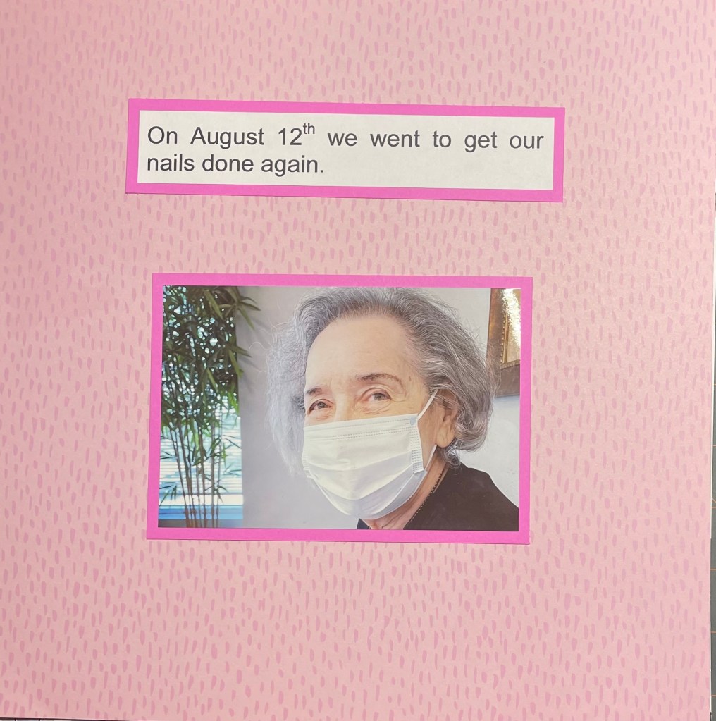 Hello and welcome back to another installment of simple scrapbook pages for my mom. As I have mentioned before, my mother resides in an assisted living facility and she has vascular dementia. I have decided to make her an scrapbook album to show her what she did when the facility was not in lockdown. I am making all the pages simple so she can better concentrate on the story, not a lot of embellishments. Although I’m sure she would like that as well.