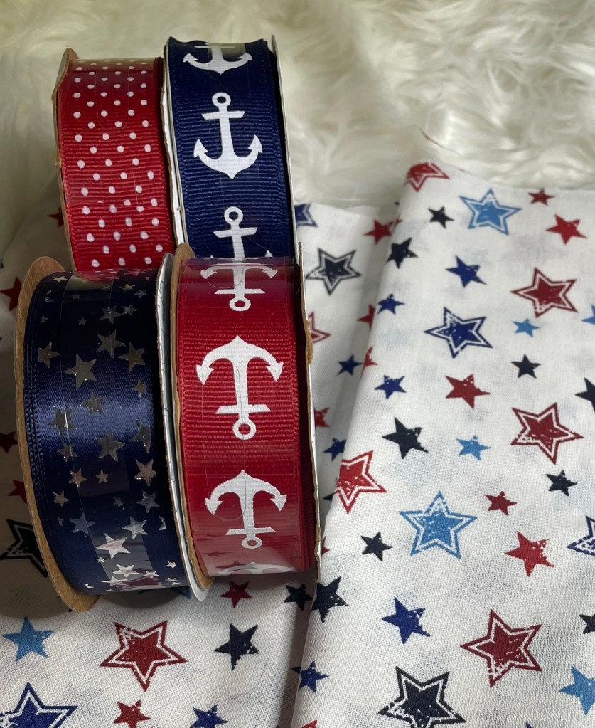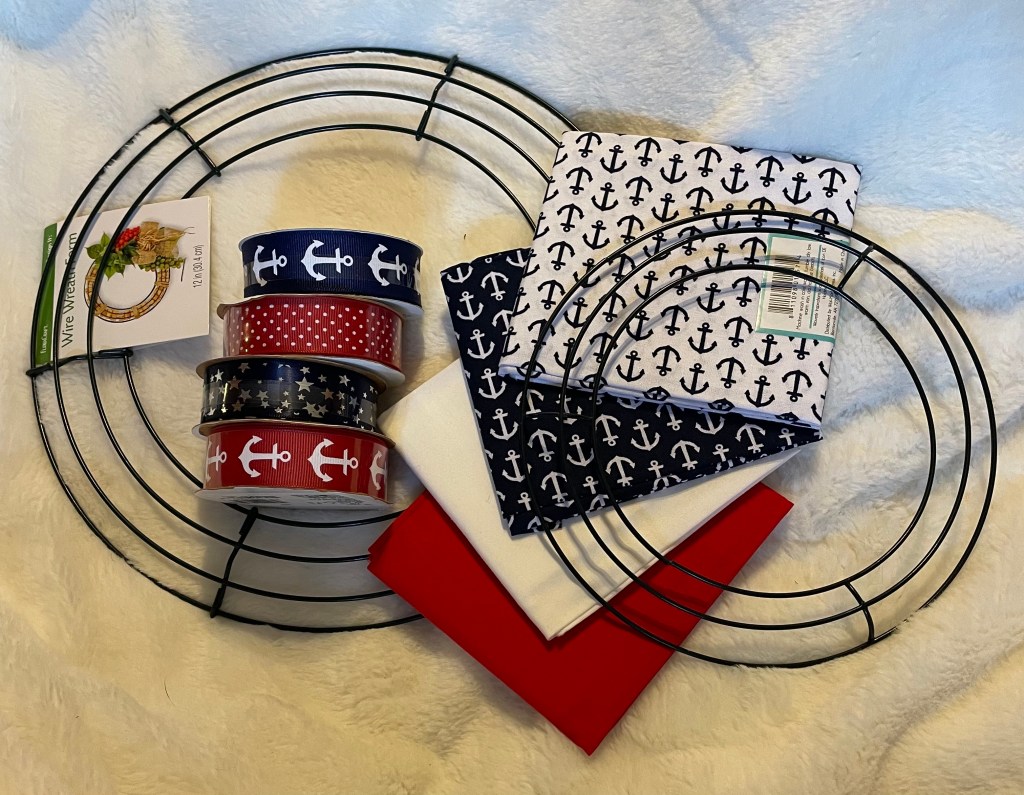 I decided I would make a small rag wreath for the door. Of course it would be a nautical theme. I lucked out and found the perfect fat quarters with anchors on them at Walmart. I also purchased some fat quarters at Joanns along with some red fabric and white dots. I felt like I need an equal amount of patterned and solid fabrics to make it work.