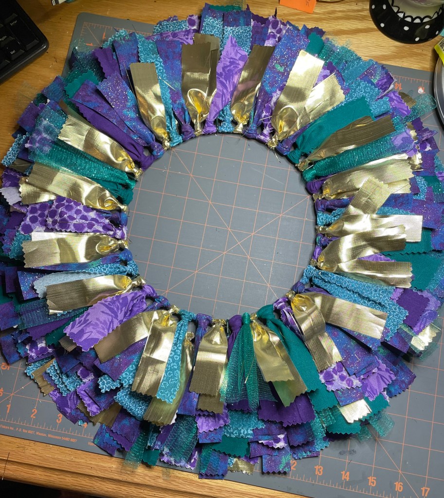 I actually kept track of the number of strips used for this project. The outer ring has 76 fabric strips, the middle ring has 64 fabric strips, and the inner ring has 55 fabric strips. So, it too a total of 195 fabric strips to make this wreath.