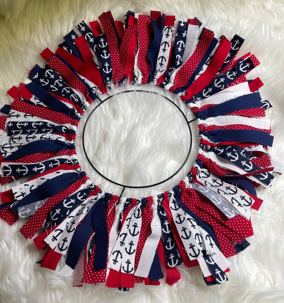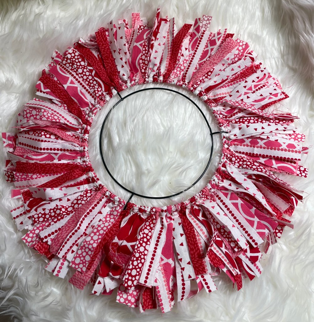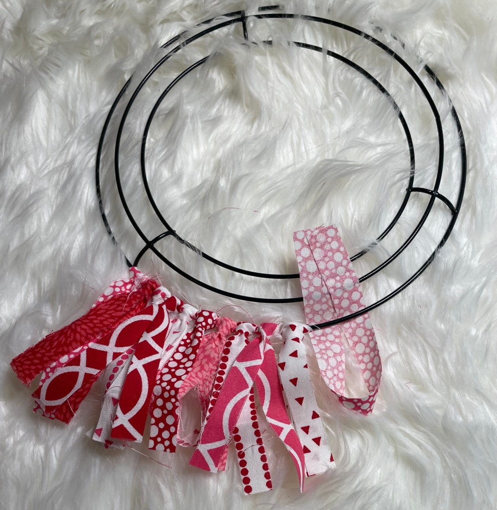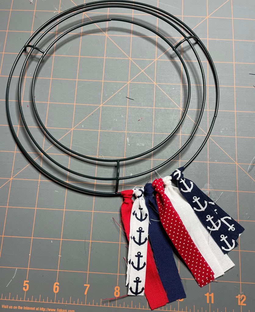The final size of the fabric strips is 1/2 to 3/4 inch wide by 7 inches long. Fabric strips will be attached to a 12 inch round wire wreath form that I purchased from Walmart.