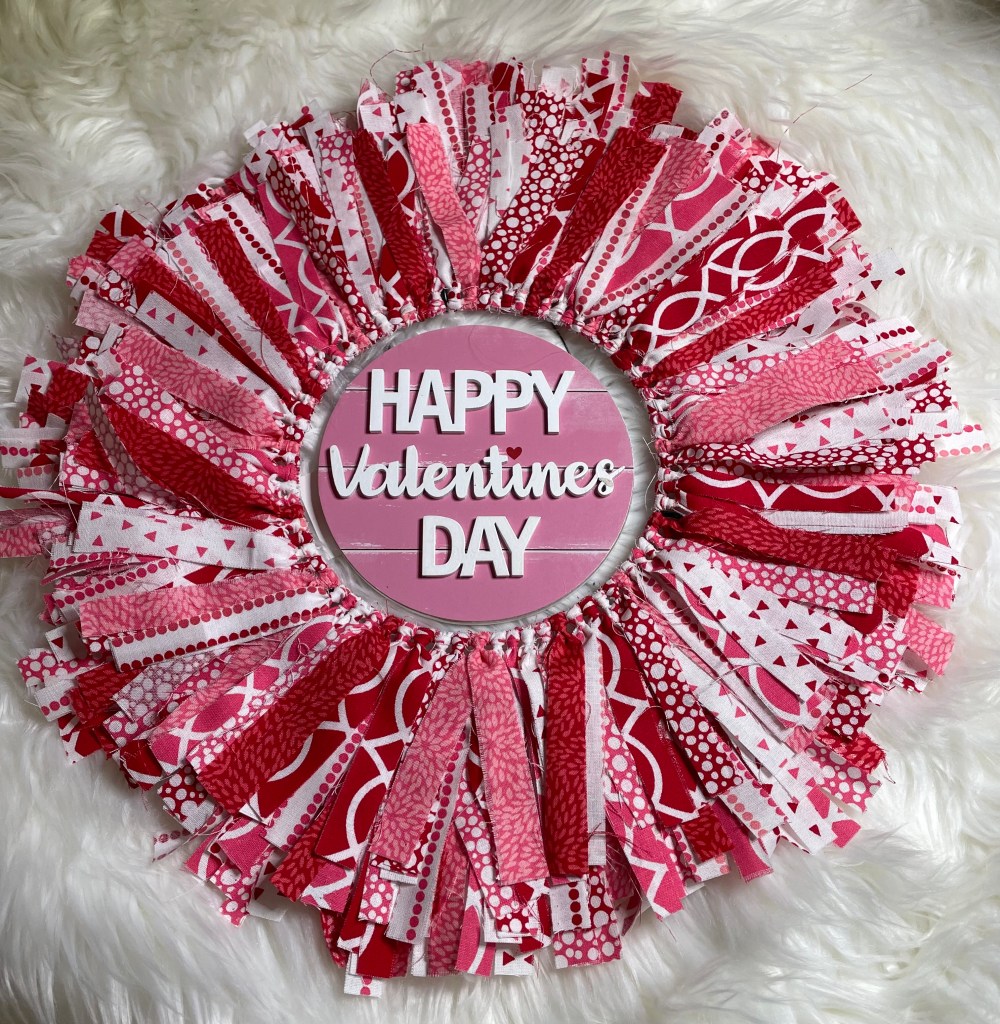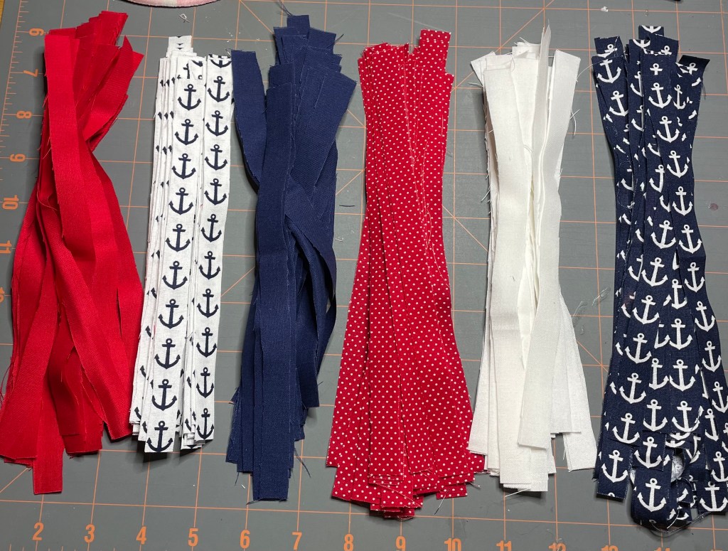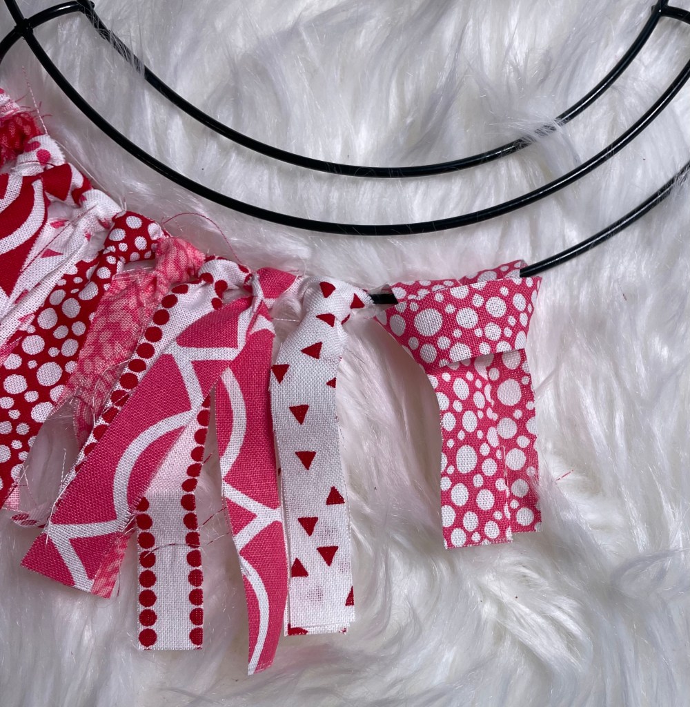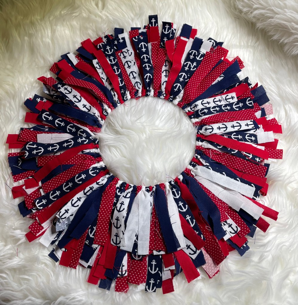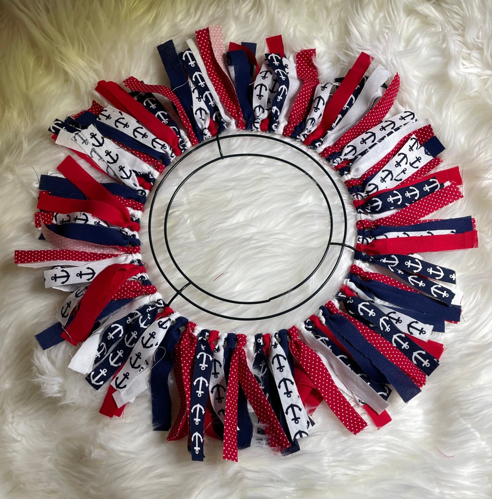 The final size of the fabric strips is 1/2 to 3/4 inch wide by 7 inches long. Fabric strips will be attached to a 12 inch round wire wreath form that I purchased from Walmart.