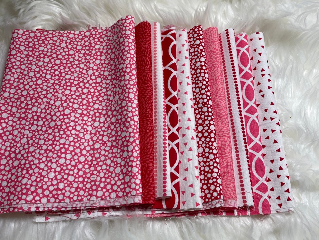 The pink and blue fabrics have white dots on them.